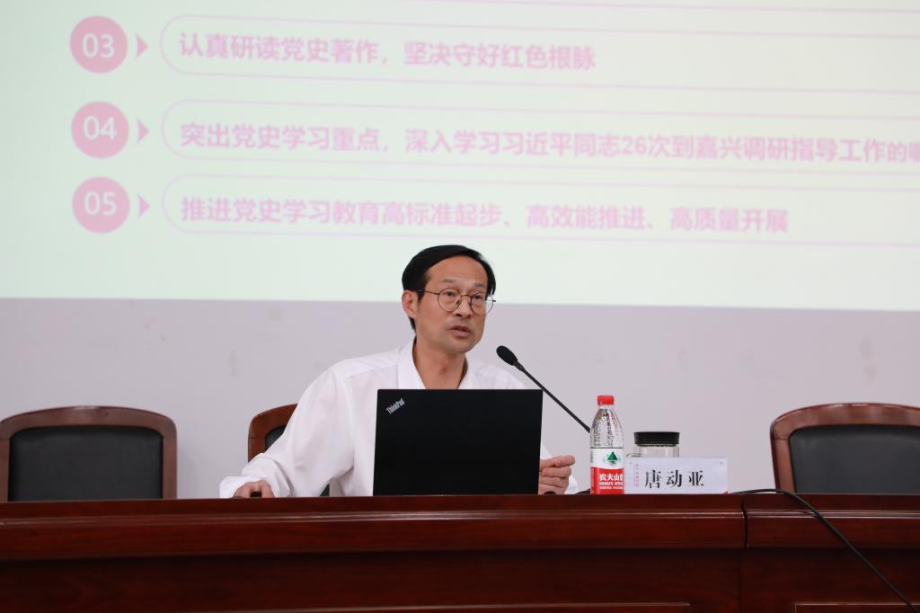 唐动亚以“光辉历程——中国共产党的一百年(1921-2021)”为题,从深入学习习近平总书记关于党的历史的重要论述,认识和把握历史发展规律;坚定不移扛起政治担当,充分认识开展党史学习教育的重大意义;认真研读党史著作,坚决守好红色根脉;突出党史学习重点,深入学习习近平同志26次到嘉兴调研指导工作的嘱托和教诲;推进党史学习教育高标准起步、高效能推进、高质量开展五个方面,结合嘉兴市党史学习教育动员部署的总体要求和具体内容作了系统阐述。