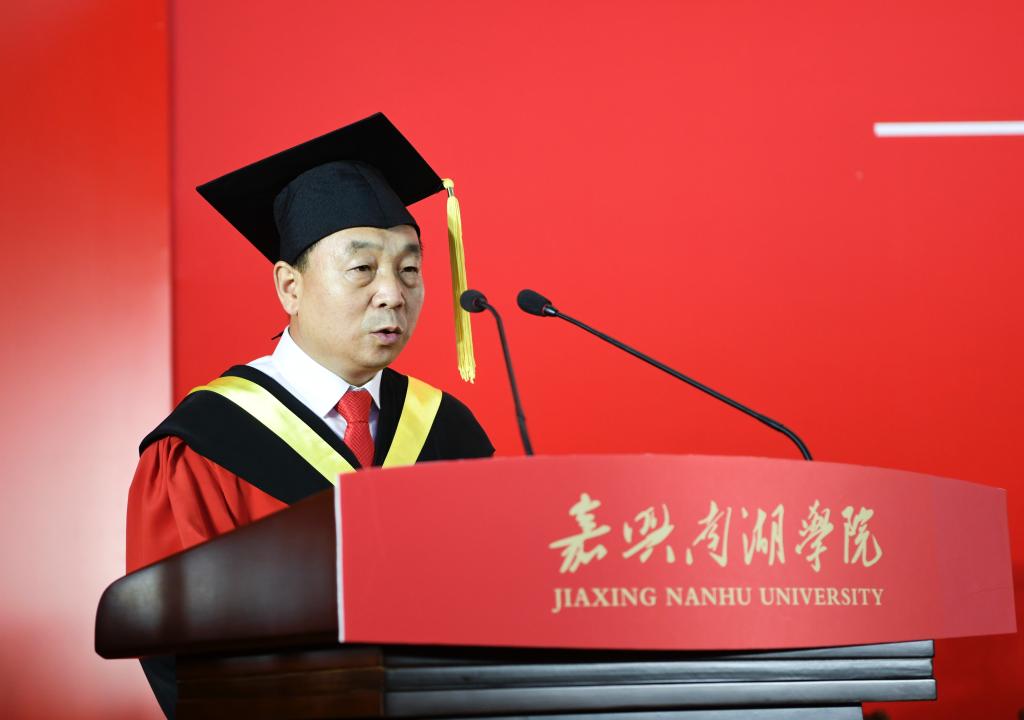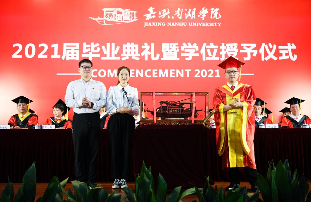 毕业典礼上,2021届全体党员毕业生向母校捐赠红船模型,祝福母校在新的起点扬帆起航、蝶变跃升。校长贾文胜代表学校接受捐赠。