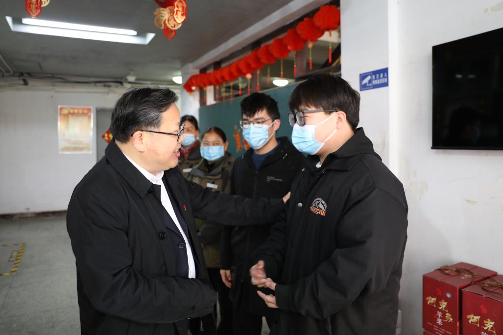 盛付祥一行来到学生公寓看望留校学生,得知学生们因为疫情原因选择留校后,盛付祥要求学校相关部门做好服务保障工作,确保学生在校过好年,叮嘱同学们要安排好假期生活,合理进行体育锻炼和文娱活动,并祝福他们学习进步、节日快乐。