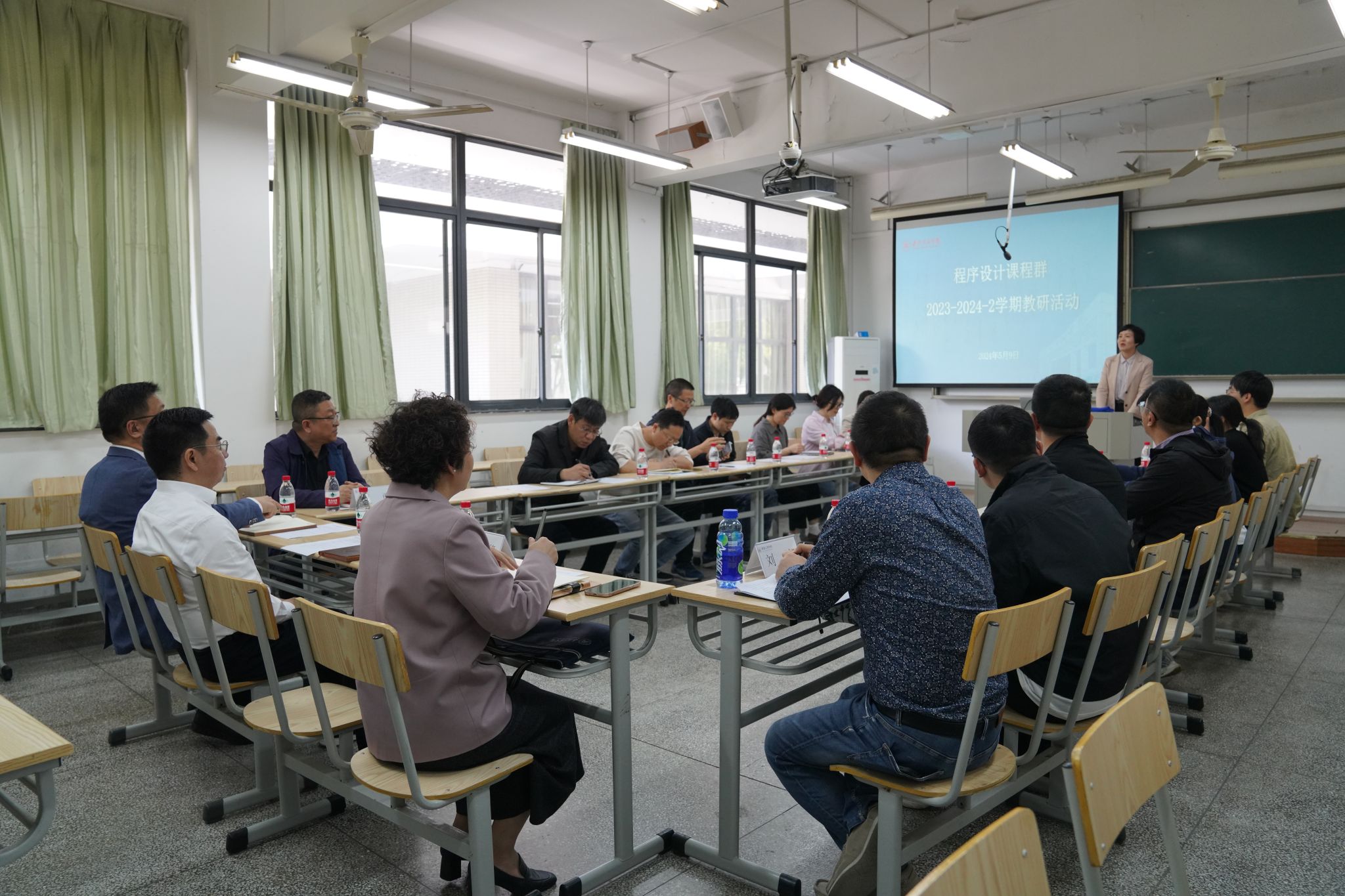 研讨现场,主备教师曹雪亚分享了备课思路,展示了初备教案,程序设计课程群的老师们结合自己的教学实践提出了自己的想法和意见。